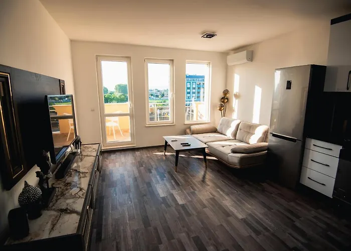 The 84 m^2 Modern Spacious 1Bd Apartment For Two In Nesebar includes a terrace and is located 25 minutes on foot from Camel Park Sunny Beach. The apartment features Wi-Fi throughout the property.